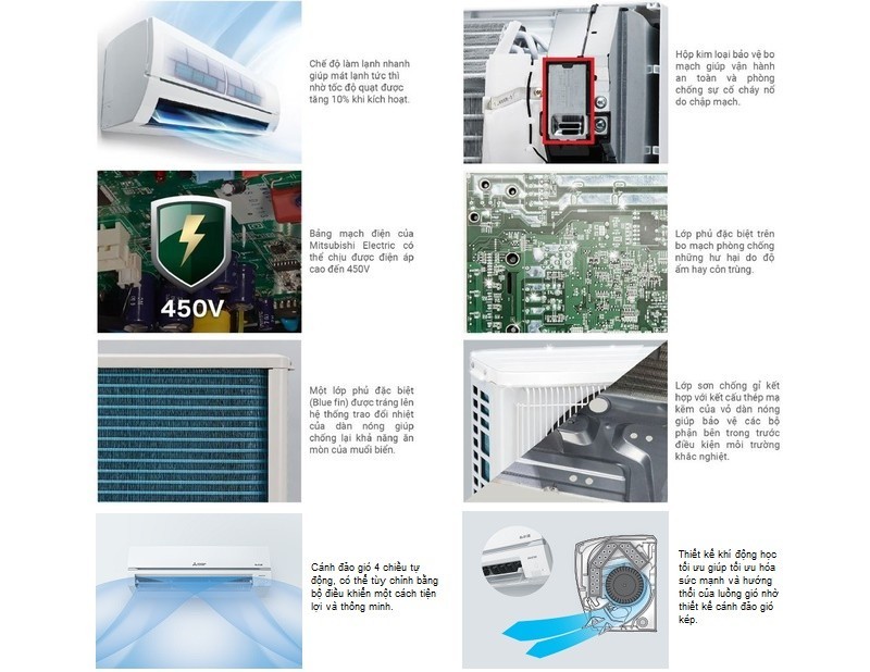 Với bảng mạch chịu điện áp cao đến 450V, máy lạnh Mitsubishi cho khả năng làm lạnh nhanh giúp mát lạnh tức thì nhờ tốc độ quạt được tăng 10% khi kích hoạt